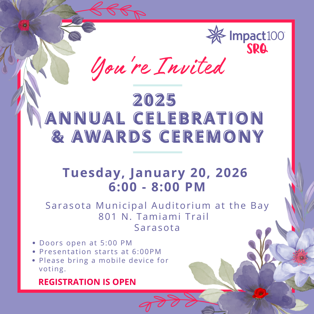 We are thrilled to announce the 10 Impact100 SRQ Grant Finalists! These nonprofits will present their initiatives at our Annual Celebration & Awards Ceremony on Tuesday, January 20th. That evening, members will cast their votes to select 8 Grant Recipients for the 2025 Giving Year. |