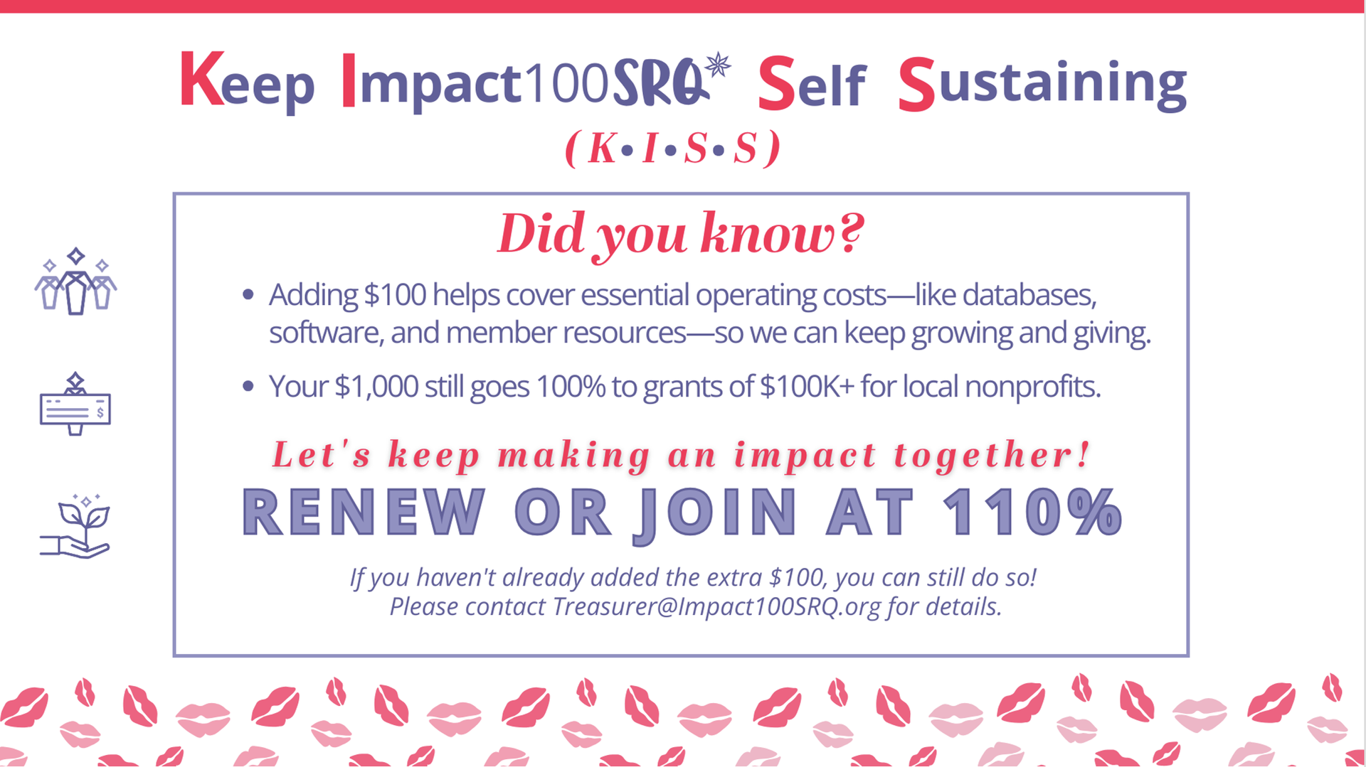 Your Impact100 SRQ Board is committed to keeping expenses as low as possible. However, rising costs make Keeping Impact Self Sustaining more challenging each year. As you join or renew for 2026, please consider choosing the 110% Membership and helping ensure the long-term sustainability of our chapter.