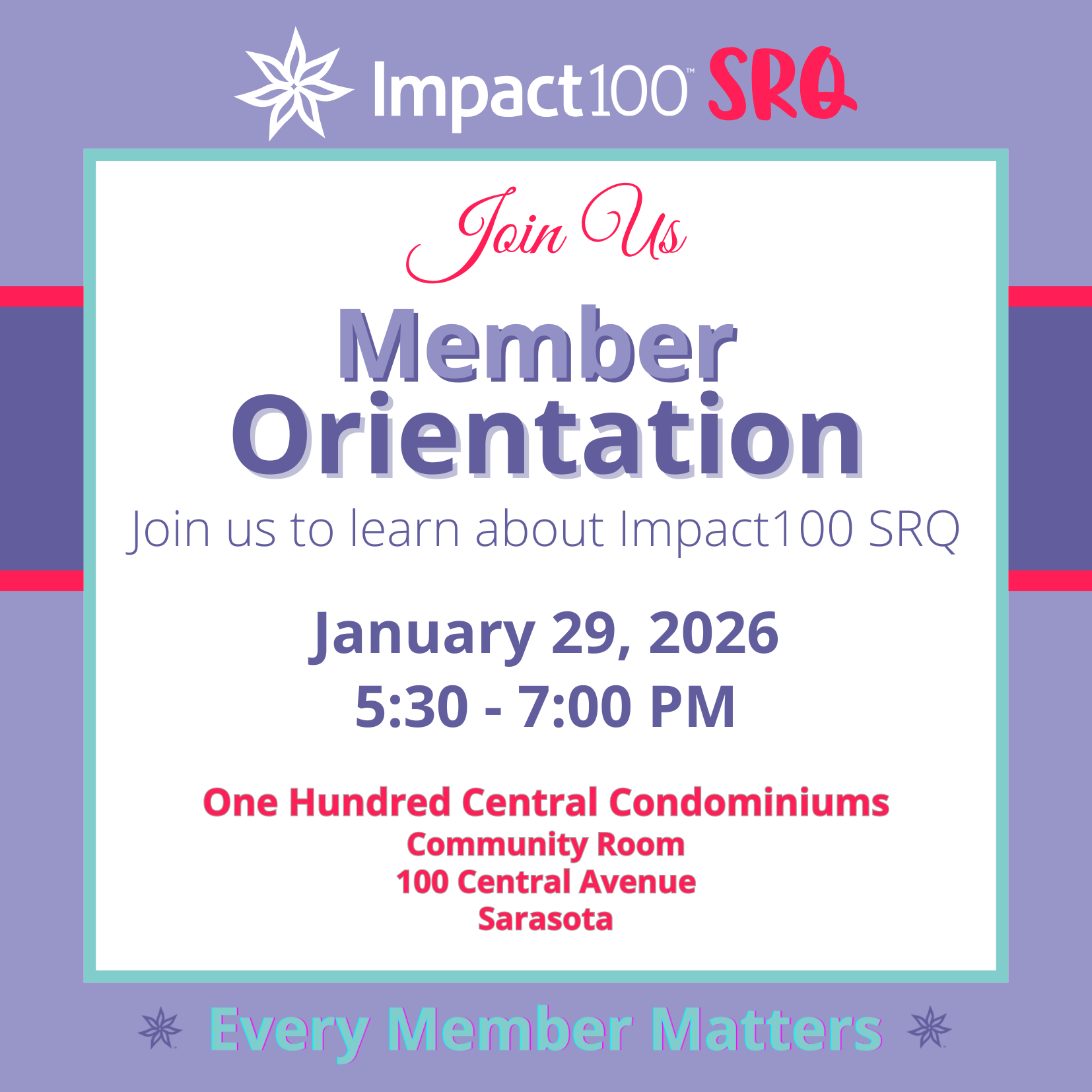 Welcome members, attend an orientation to learn what's next. Whether you are a new 2026 member, or a returning member, please join us to learn more about your membership and how to design your own experience with Impact100 SRQ.