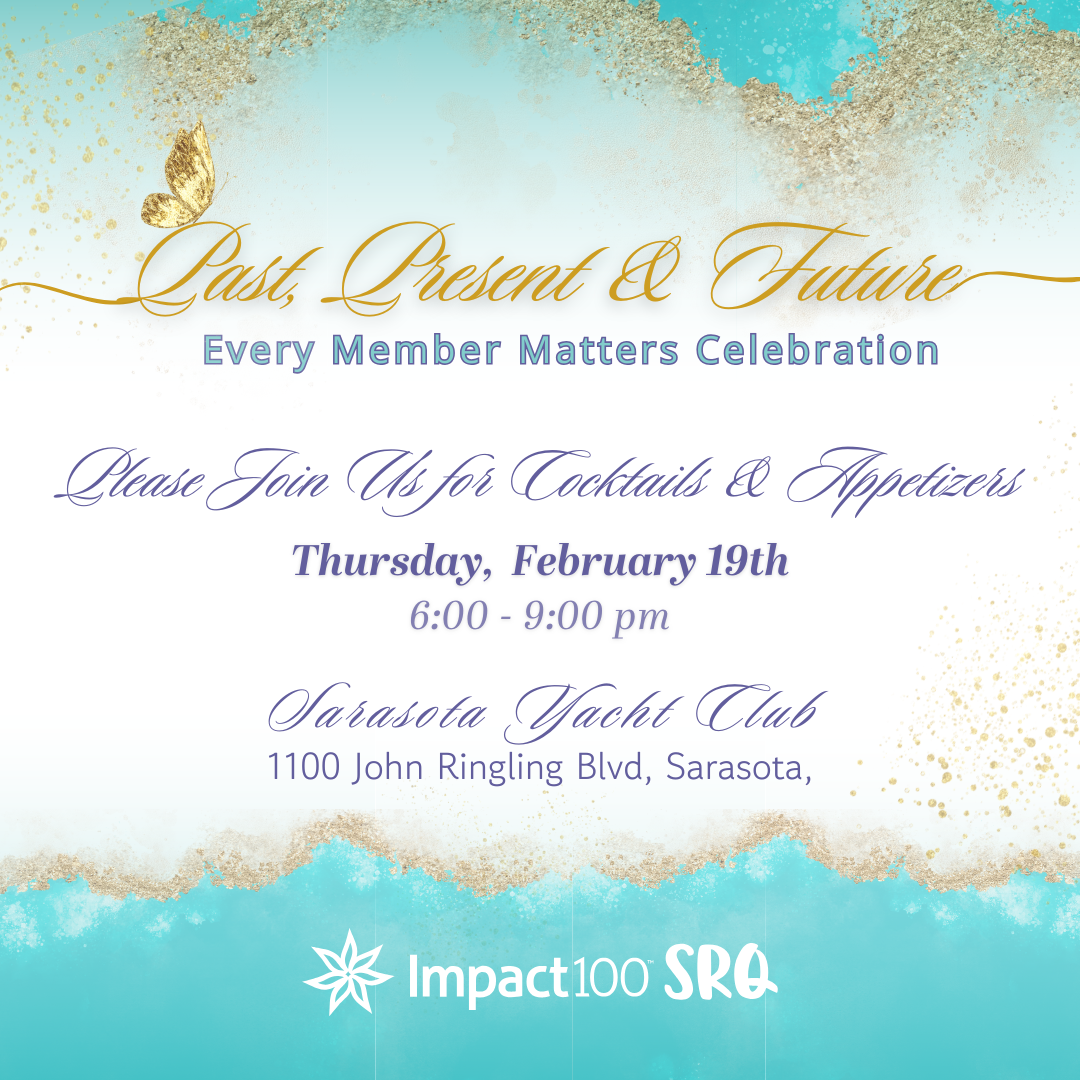 Please join us for a very special Impact100 SRQ Event as we gather in a collective tribute and honor our Past, Present, and Future members. Friends and significant others are invited to attend. This is an ideal opportunity to welcome a prospective member to join you.