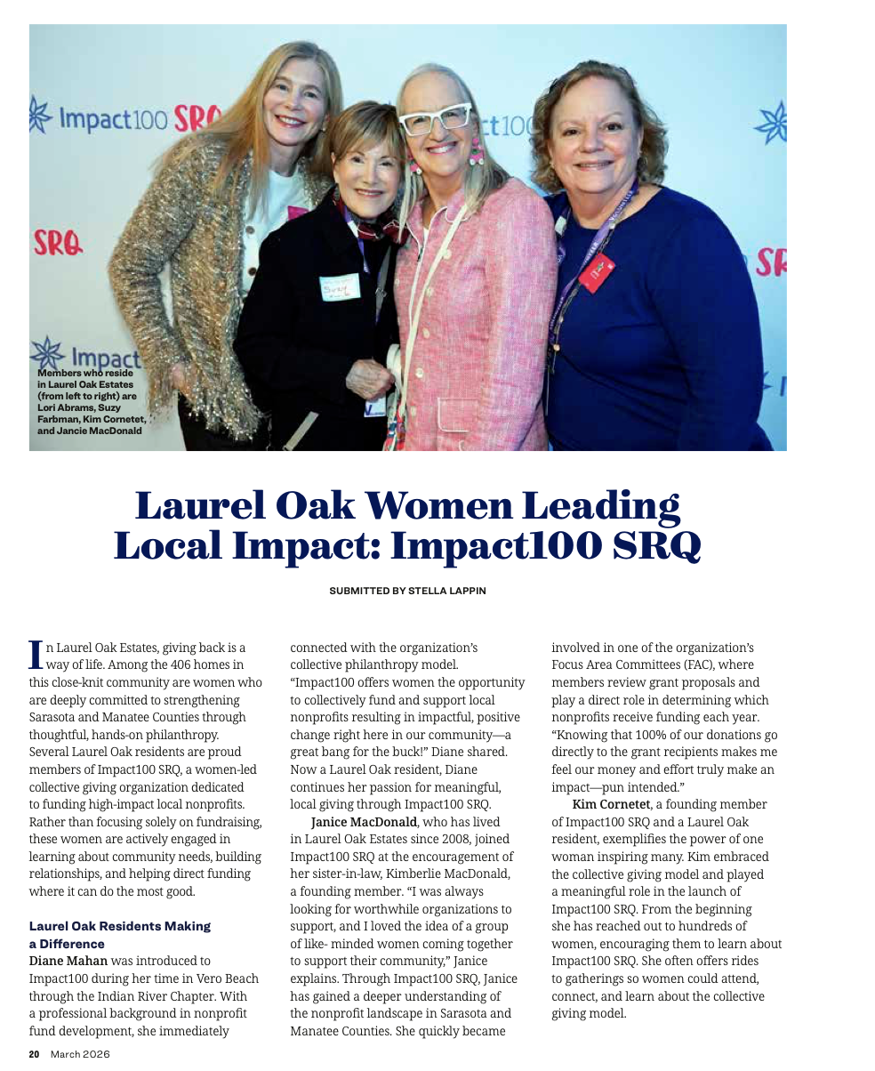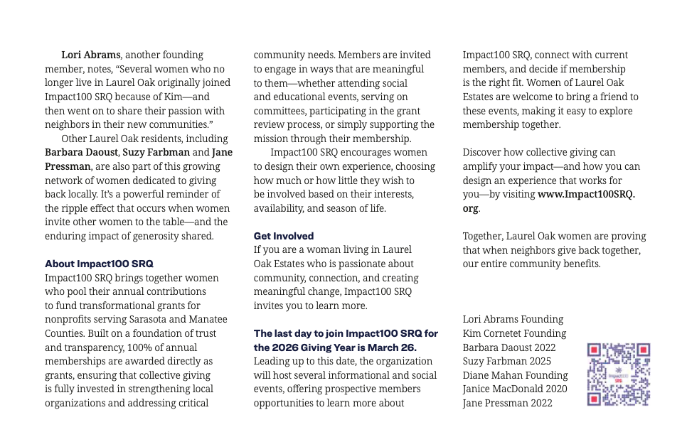 Do you have a neighborhood magazine in your community? We would love the opportunity to share the story of Impact100 SRQ and highlight members who live in your area. Featuring our members in local neighborhood publications is a wonderful way to spread awareness, celebrate the power of collective giving, and inspire more women to learn about our mission. If you would like your neighborhood to be featured, or if you have a neighborhood publication that may be interested, please contact Stella at StellaL@Impact100SRQ.org.