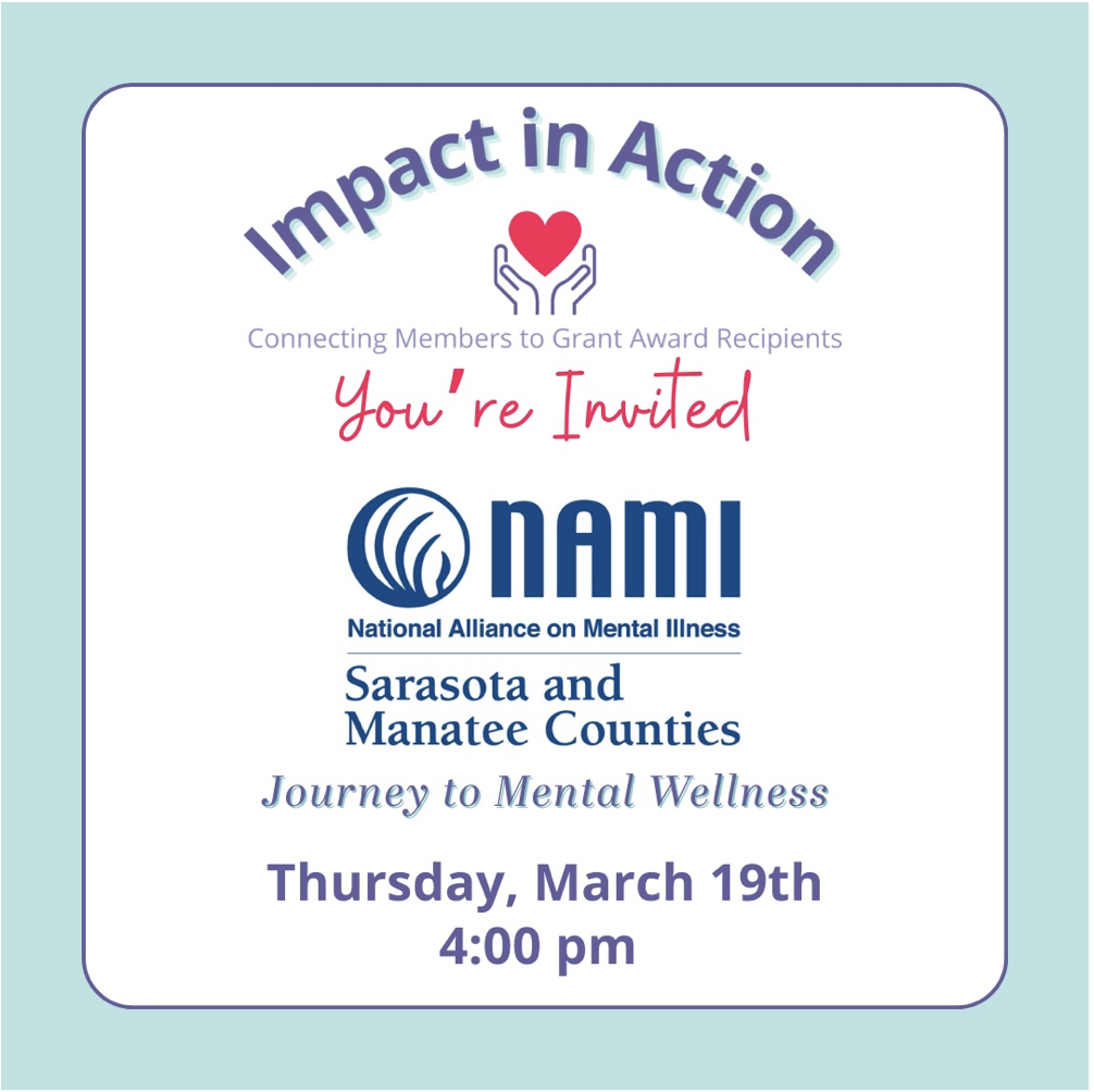 Join us to see how NAMI is helping families, individuals, and caregivers on their journey to mental wellness. Thanks to an Impact100 SRQ grant, access to peer support has expanded through the YANA Wellness Drop-In Centers and greater community outreach.