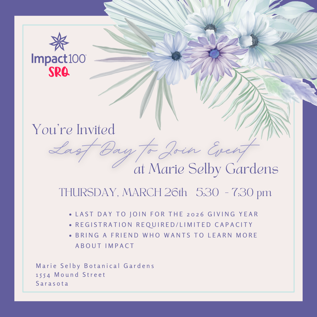 On Thursday, March 26th from 5:30–7:30 PM at Marie Selby Botanical Gardens, we’ll gather for our Last Day to Join Event — a beautiful evening set in one of Sarasota’s most inspiring spaces. This isn’t just a social event. It’s the final opportunity to become part of our 2026 Giving Year and help shape the transformational grants we will award in our community. Since 2019, Impact100 SRQ has awarded 38 grants totaling over $4.1 million across Sarasota and Manatee counties. That impact only happens because women like you choose to renew. Choose to continue. Choose to believe that collective giving changes lives. If you’ve already renewed — thank you. Your commitment fuels everything we do. If you haven’t yet, this is your moment. Renewing your membership ensures: