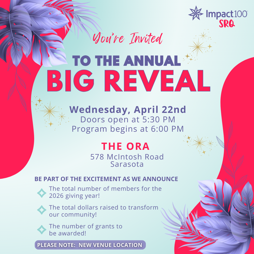 There is one night each year when anticipation fills the room and hearts beat a little faster as the true power of collective giving comes to life. Join us on Wednesday, April 22nd at The Ora, for our Annual Big Reveal — the celebration where we announce the total number of Impact100 SRQ members for the 2026 Giving Year and, most exciting of all, the total dollars we will award to nonprofits across Sarasota and Manatee counties.